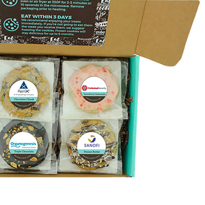 Make a lasting impression with our gourmet cookies that proudly display your company logo! No one’s going to throw your cookies in the trash on the way out of the conference hall or office. We offer a delicious alternative to boring company branded swag. We'll print your company logo in full color on high quality gloss sticker on each cookie.